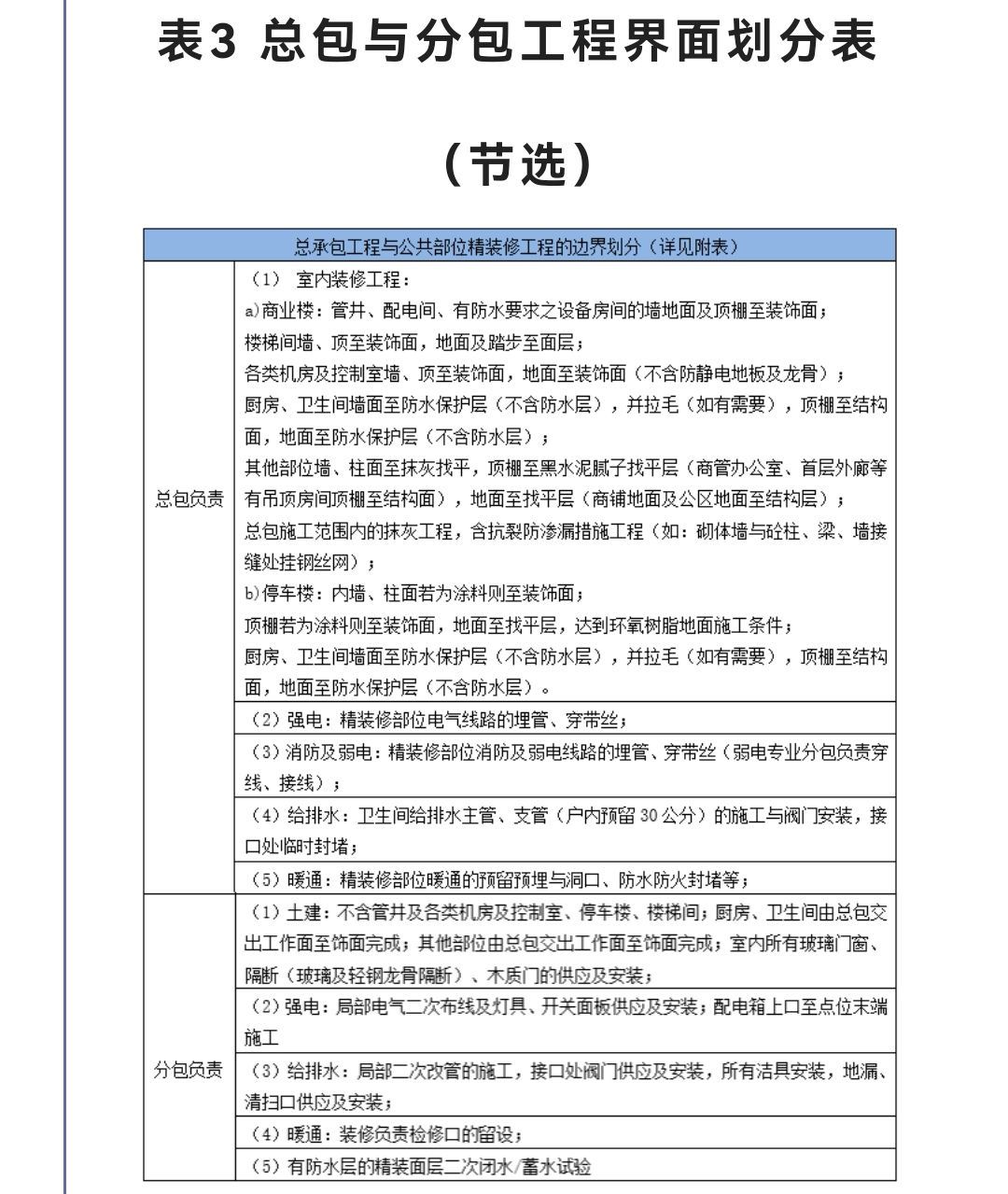 表3 總包與分包工程界面劃分表(節(jié)選)