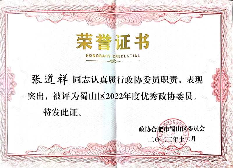 政協(xié)合肥市蜀山區(qū)委員會(huì) 張道祥被評(píng)為2022年度“優(yōu)秀政協(xié)委員”