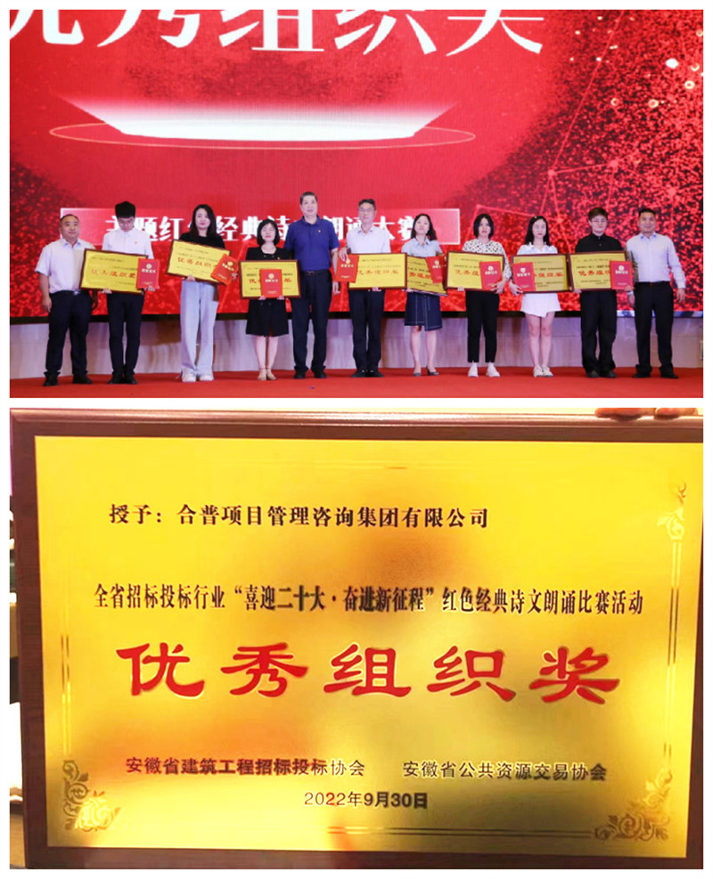 誦讀紅色經典,賡續(xù)紅色血脈。9月30日,由安徽省建筑工程招標投標協會、安徽省公共資源交易協會聯合主辦的全省建筑工程招標投標行業(yè)“喜迎二十大·奮進新征程”紅色經典詩文朗誦決賽在合肥市白金漢爵酒店正式拉開帷幕,我司參賽作品《永遠跟黨走·共筑中國夢》榮獲三等獎,并且作為協辦單位,出色完成各項任務,受到行業(yè)單位的認可,獲得“優(yōu)秀組織獎”。
