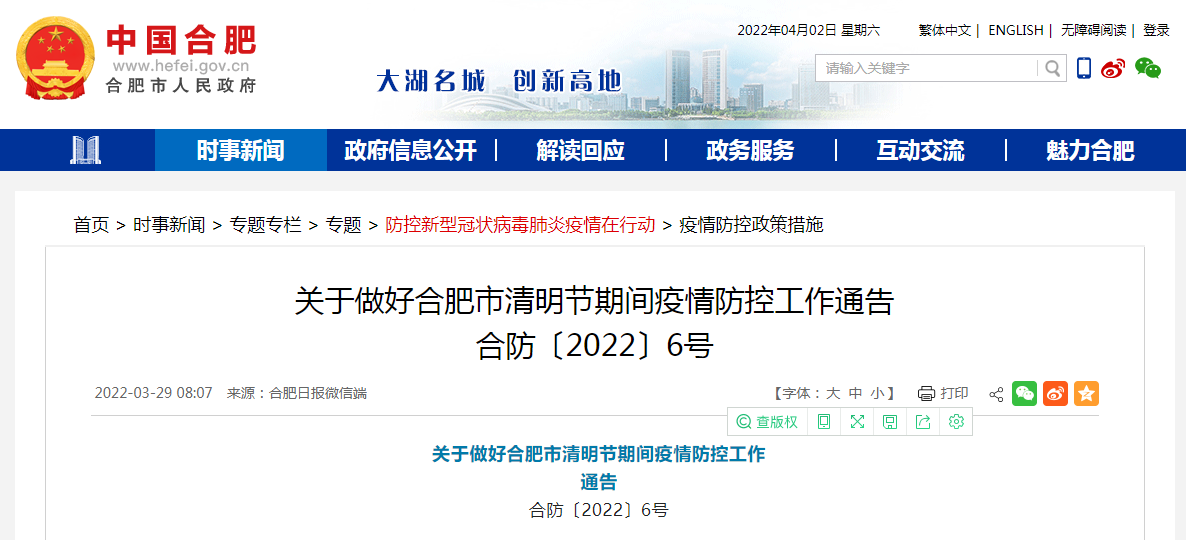 2022年3月29日合肥市人民政府官網(wǎng)下發(fā)了合防【2022】6號(hào)“關(guān)于做好合肥市清明節(jié)期間疫情防控工作通告”,旨在最大限度保護(hù)人民生命安全和身體健康。