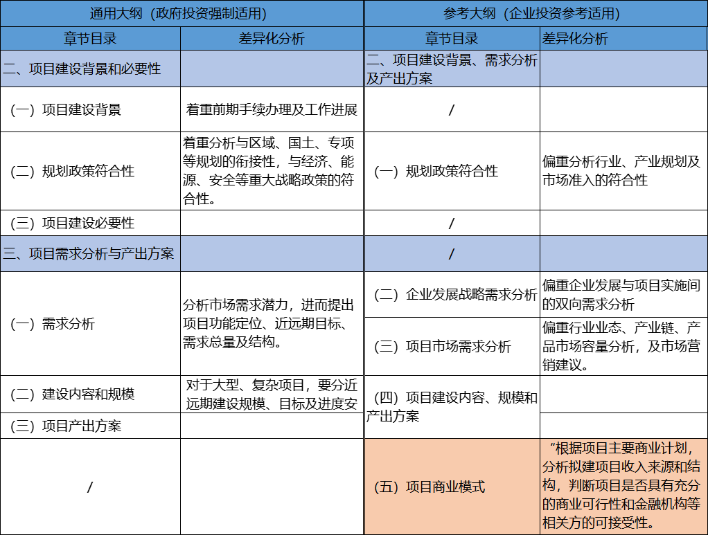 通過(guò)內(nèi)容對(duì)比分析,發(fā)現(xiàn)《通用大綱》二、三部分對(duì)應(yīng)《參考大綱》第二部分(項(xiàng)目建設(shè)背景、需求分析及產(chǎn)出方案),差異化較為明顯,但《通用大綱》更注重項(xiàng)目的合規(guī)性以及與區(qū)域、國(guó)土等上位規(guī)劃的符合性,在需求分析上偏重市場(chǎng)潛力、項(xiàng)目功能定位及近遠(yuǎn)期目標(biāo)實(shí)現(xiàn)情況。而《參考大綱》更偏重行業(yè)、業(yè)態(tài)、產(chǎn)業(yè)鏈及市場(chǎng)準(zhǔn)入情況、企業(yè)戰(zhàn)略、營(yíng)銷方案及商業(yè)模式等,市場(chǎng)導(dǎo)向性更加明顯。
