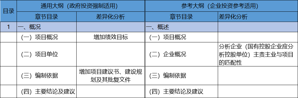 《通用大綱》在項(xiàng)目概況部分增加了績(jī)效目標(biāo),意在為項(xiàng)目決策機(jī)構(gòu)后期開(kāi)展項(xiàng)目分析評(píng)價(jià)提供考核指標(biāo),在編制依據(jù)中增加了項(xiàng)目建議書(shū)、建設(shè)規(guī)劃及批復(fù)等依據(jù),該點(diǎn)與政府投資項(xiàng)目實(shí)行審批制,需報(bào)送項(xiàng)目建議書(shū)及可研報(bào)告相對(duì)應(yīng),使得可研編制依據(jù)更加充分,完整。而在《參考大綱》企業(yè)概況中,提出要分析企業(yè)(或其上級(jí)控股單位的主責(zé)主業(yè))綜合能力與擬建項(xiàng)目的匹配性,意在判斷企業(yè)是否具備項(xiàng)目的承建能力。