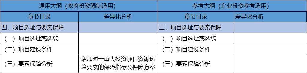 兩個(gè)大綱該部分結(jié)構(gòu)及內(nèi)容基本一致,在《通用大綱》要素保障分析中增加了對(duì)于重大投資項(xiàng)目資源環(huán)境要素保障指標(biāo)及保障方案的描述要求,該點(diǎn)體現(xiàn)了審批部門對(duì)于重大政府投資項(xiàng)目的特別保障要求及謹(jǐn)慎程度。
