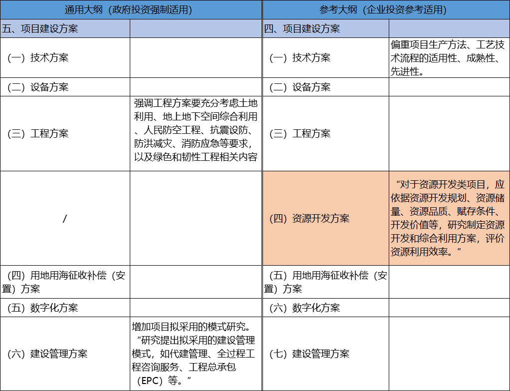 從結(jié)構(gòu)上看,該部分《參考大綱》中增加了資源開(kāi)發(fā)方案,要求資源開(kāi)發(fā)項(xiàng)目增加資源開(kāi)發(fā)方案分析。從內(nèi)容上看,《通用大綱》在工程方案中強(qiáng)調(diào)工程方案要考慮的因素更多,更加注重項(xiàng)目對(duì)社會(huì)、公眾安全、環(huán)保、節(jié)能等方面的要求,在建設(shè)管理方案中要增加項(xiàng)目擬采用的模式研究,明確項(xiàng)目模式,體現(xiàn)了項(xiàng)目合規(guī)性監(jiān)管要求。