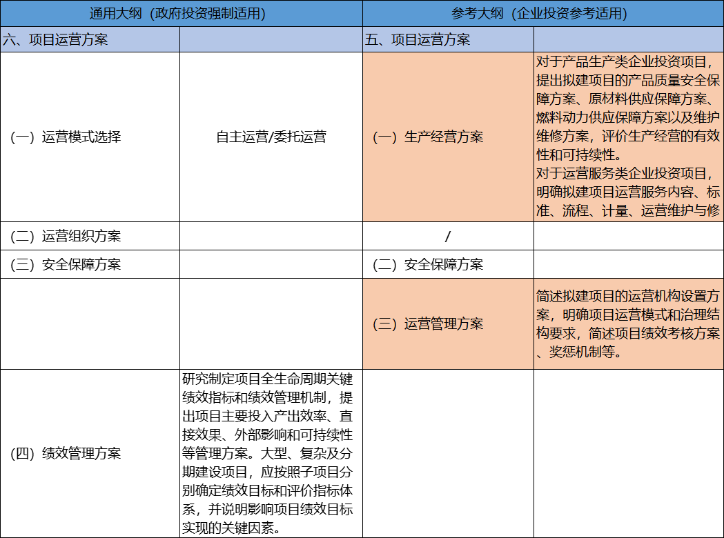 該部分,兩個(gè)大綱結(jié)構(gòu)和內(nèi)容上差異較為明顯,《通用大綱》則強(qiáng)調(diào)運(yùn)營(yíng)模式的確定、運(yùn)營(yíng)組織及績(jī)效管理,改變當(dāng)下可行性研究報(bào)告中“重建設(shè)、輕運(yùn)營(yíng)”的做法,也體現(xiàn)了項(xiàng)目全生命周期監(jiān)管的理念,而《參考大綱》則更偏重建設(shè)單位對(duì)項(xiàng)目的生產(chǎn)、經(jīng)營(yíng)及運(yùn)營(yíng)管理,強(qiáng)化建設(shè)單位的運(yùn)營(yíng)能力,保障項(xiàng)目建成后可持續(xù)經(jīng)營(yíng)。