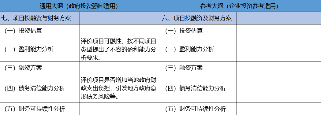 兩個(gè)大綱該部分結(jié)構(gòu)及內(nèi)容基本一致,在《通用大綱》盈利能力分析章節(jié)中,提出要通過(guò)項(xiàng)目自身的盈利能力分析,評(píng)價(jià)項(xiàng)目可融資性,要根據(jù)項(xiàng)目類型(政府直接投資/資本金注入/綜合性開(kāi)發(fā)項(xiàng)目)有針對(duì)性地開(kāi)展項(xiàng)目盈利能力分析。