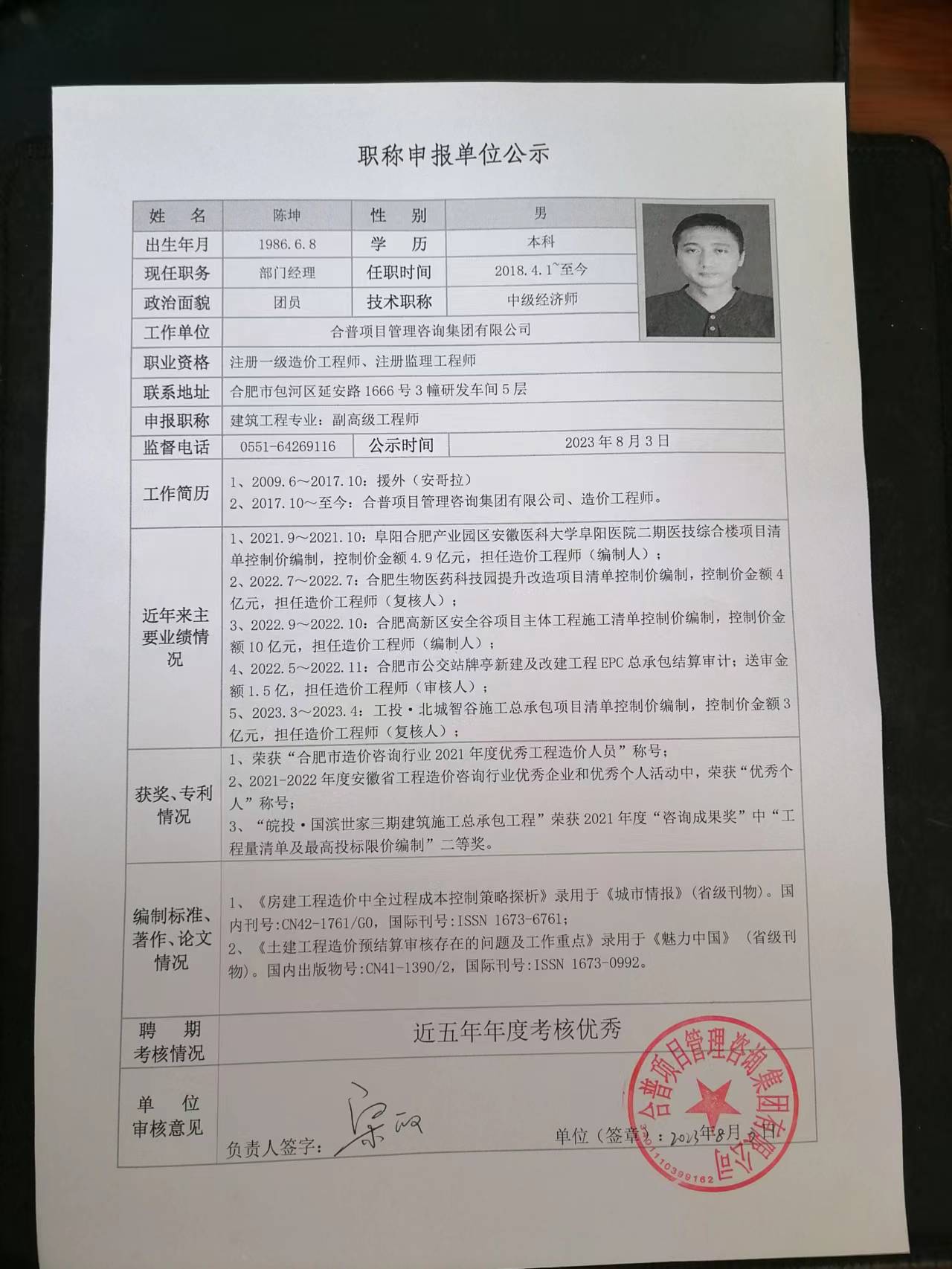 陳坤同志申報(bào)建筑工程系列高級(jí)專業(yè)技術(shù)資格單位公示