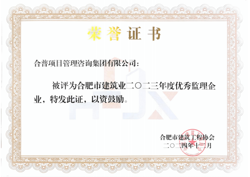 近日,合肥市建筑工程協(xié)會(huì)發(fā)布表彰文件,對(duì)全市建筑業(yè)2023年度優(yōu)秀企業(yè)、單項(xiàng)先進(jìn)企業(yè)及先進(jìn)個(gè)人進(jìn)行表彰。合普憑借穩(wěn)健的業(yè)務(wù)表現(xiàn)和良好的行業(yè)口碑,榮獲“合肥市建筑業(yè)2023年度優(yōu)秀監(jiān)理企業(yè)”稱號(hào)。同時(shí),集團(tuán)的汪志華、凡濤、陳志平三位員工,因在工作中展現(xiàn)出的專業(yè)素養(yǎng)與敬業(yè)精神,榮獲“合肥建筑業(yè) 2023 年度優(yōu)秀總監(jiān)理工程師”稱號(hào)。