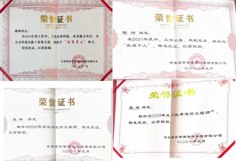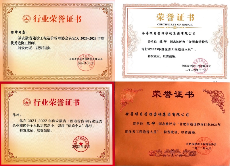 陳坤的付出也得到了公司和行業(yè)的高度認(rèn)可。他兩次被授予集團(tuán)“優(yōu)秀員工”稱(chēng)號(hào),多次榮獲集團(tuán)“優(yōu)秀造價(jià)工程師”等榮譽(yù)稱(chēng)號(hào)。行業(yè)內(nèi),陳坤榮獲安徽省建設(shè)工程造價(jià)管理協(xié)會(huì)2023-2024年度“優(yōu)秀造價(jià)工程師”、2021-2022年度“優(yōu)秀個(gè)人”稱(chēng)號(hào),多次榮獲合肥市建設(shè)工程造價(jià)協(xié)會(huì)“優(yōu)秀工程造價(jià)人員”稱(chēng)號(hào);參與編制的成果文件更是在評(píng)選中多次獲獎(jiǎng)。這些榮譽(yù)不僅是對(duì)他個(gè)人能力的肯定,更是對(duì)他工作態(tài)度和責(zé)任心的認(rèn)可。他用自己的實(shí)際行動(dòng)詮釋了什么是敬業(yè)、什么是擔(dān)當(dāng),成為了造價(jià)部骨干力量。