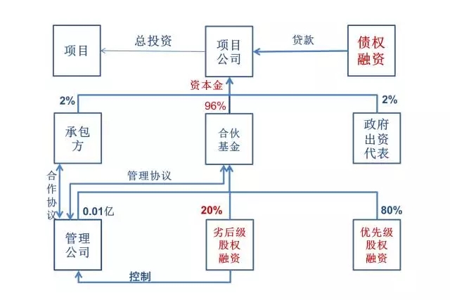 PPP融資包括約占項(xiàng)目總投資75%的債權(quán)融資(貸款)和約占25%的股權(quán)融資。其中股權(quán)融資除了政府方出資外,一般包括約占股權(quán)20%的劣后級(jí)股權(quán)融資和約占股權(quán)80%的優(yōu)先級(jí)股權(quán)融資。