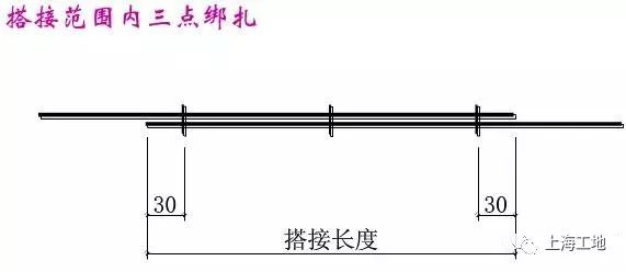 注:每根鋼筋在搭接長(zhǎng)度內(nèi)必須采用三點(diǎn)綁扎,用雙絲綁扎搭接鋼筋兩端30mm處,中間再綁扎一道。