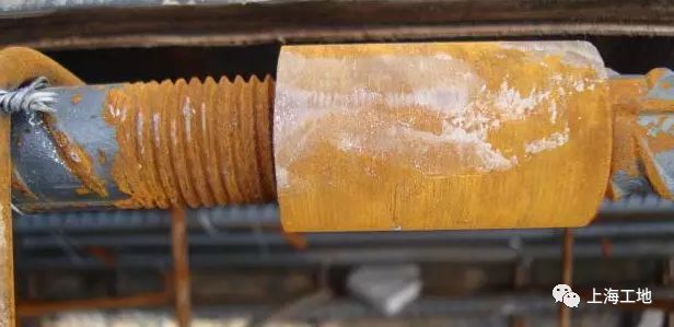 防治措施:鋼筋端部直螺紋絲扣加工好以后,套上塑料帽對(duì)絲扣進(jìn)行保護(hù)。