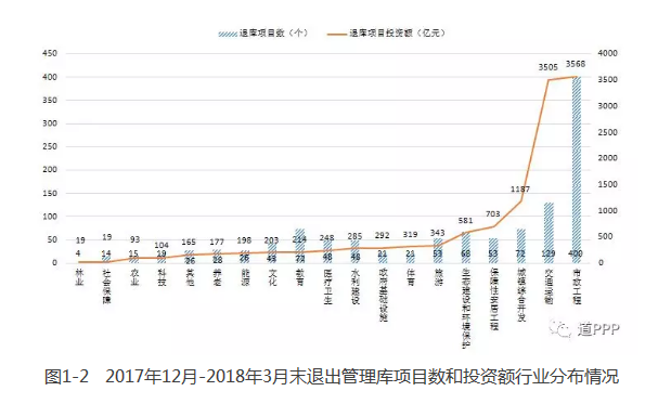 自2017年11月16日《關(guān)于規(guī)范政府和社會資本合作(PPP)綜合信息平臺項目庫管理的通知》(財辦金〔2017〕92號,以下簡稱92號文)發(fā)布后,各地積極開展項目庫清理工作。自2017年12月至2018年3月末,綜合信息平臺已累計清理管理庫項目1,160個,累計清減投資額1.2萬億元,覆蓋除西藏、新疆兵團外29個。ㄗ灾螀^(qū)、直轄市)和全部19個行業(yè)領(lǐng)域,如圖1-1和圖1-2。