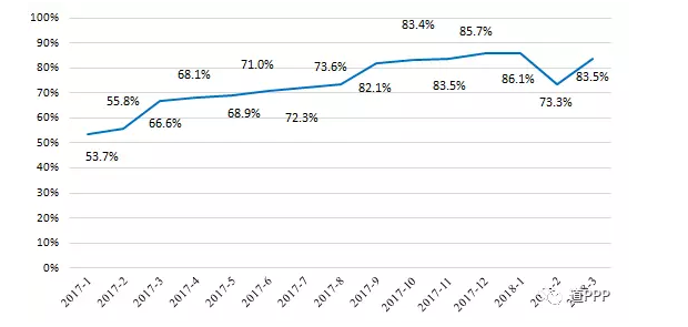 項目落地率,指執(zhí)行和移交兩個階段項目數(shù)之和與管理庫項目數(shù)的比值。3月落地示范項目新增項目42個、投資額758億元。3月末示范項目總體落地率83.5%,環(huán)比上升10.2個百分點。示范項目總體落地率變化如圖2-2-1。