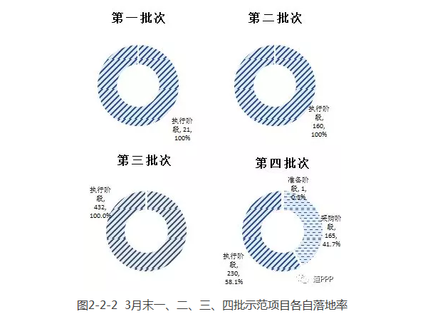 第一批21個示范項目自2016年末以來、第二批160個示范項目自2017年3月末以來已100%落地,第三批432個示范項目本月100%落地。第四批示范項目中落地項目230個,落地率58.1%。四批示范項目各自落地率如圖2-2-2。