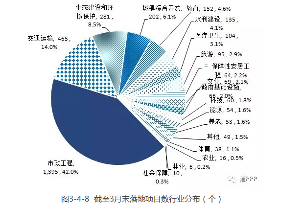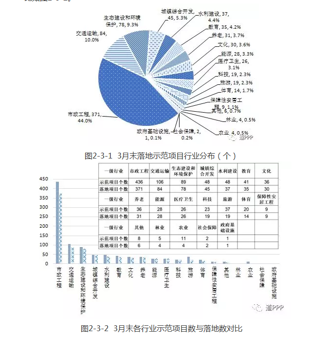 843個落地示范項目中,市政工程類371個,占44.0%;交通運輸類84個,占10.0%;生態(tài)建設(shè)和環(huán)境保護類78個,占9.3%;其他各類共310個,占36.2%。3月末落地示范項目行業(yè)分布如圖2-3-1,各行業(yè)示范項目數(shù)與落地數(shù)對比如圖2-3-2。
