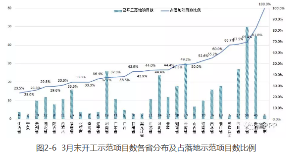 3月新增已開工示范項目10個,開工率環(huán)比下降1.2個百分點;3月末累計已開工示范項目總數(shù)394個,開工率46.7%。如圖2-6,山東(含青島)開工示范項目數(shù)為50個居首位,安徽和云南分別以45個和30個居第二位、第三位,占其各自落地示范項目數(shù)的比例分別為69.4%、81.8%、49.2%。其中,河北開工示范項目新增了3個,增幅最大。