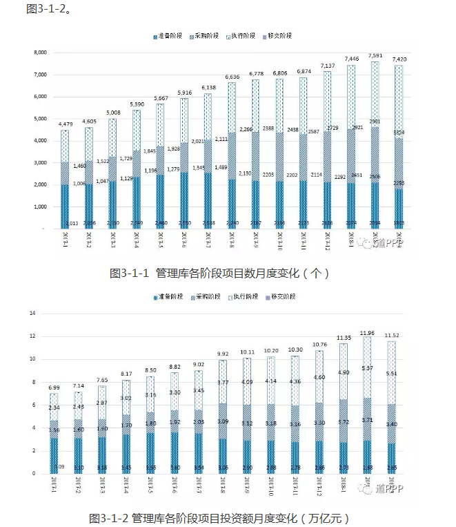2018年一季度管理庫新增項目283個、投資額7,472億元,其中3月凈減項目171個、投資額4,567億元,管理庫項目總數(shù)和投資額首次出現(xiàn)回落;截至3月末累計項目總數(shù)7,420個、投資額11.5萬億元,均已完成物有所值評價和財政承受能力論證的審核,覆蓋31個。ㄗ灾螀^(qū)、直轄市)及新疆兵團和19個行業(yè)領(lǐng)域。2017年1月末至2018年3月末管理庫項目數(shù)及各階段項目數(shù)如圖3-1-1、投資額如圖3-1-2。