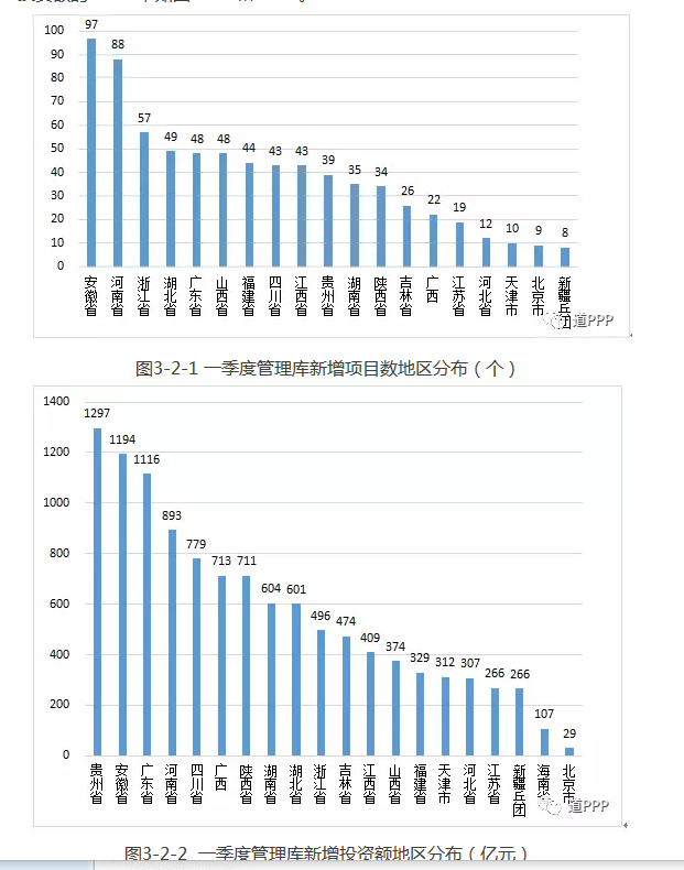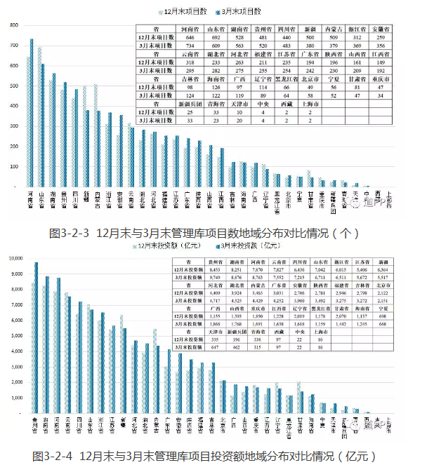一季度各地新增項目數(shù)前三位是安徽、河南、浙江,分別為97個、88個、57個,合計占管理庫新增項目總數(shù)的85.2%;一季度新增投資額前三位是貴州、安徽、廣東,分別為1,297億元、1,194億元和1,116億元,合計占管理庫新增總投資額的48.2%,如圖3-2-1和3-2-2。