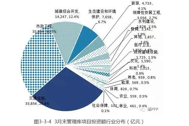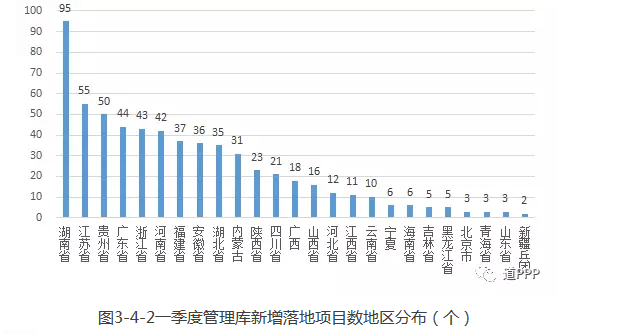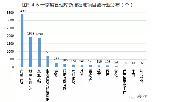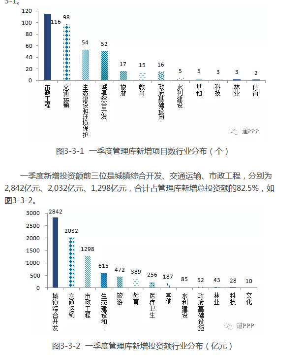 管理庫項目執(zhí)行情況:2018年一季度新增管理庫項目283個、投資額7,472億元,其中3月凈減項目171個、投資額4,567億元;截至3月末累計項目總數(shù)7,420個、投資額11.5萬億元。落地項目,2018年一季度新增落地項目595個、投資額9,044億元,其中3月新增落地項目333個、投資額1,362億元。落地率環(huán)比增加5.4個百分點。3月末累計落地項目總數(shù)3,324個、投資額5.5萬億元,落地率44.8%。2018年一季度新增已開工項目216個,其中3月新增123個;3月末累計已開工項目總數(shù)1,375個,開工率41.4%。地區(qū)方面,2018年一季度管理庫新增項目數(shù)前三位的是安徽、河南、浙江,分別為97個、88個、57個;一季度項目新增投資額前三位的是貴州、安徽、廣東,分別為1,297億元、1,194億元和1,116億元。3月管理庫新增項目數(shù)前三位的是山西、河南、江蘇;新增投資額前三位的是貴州、廣西、河北。3月末累計項目總數(shù)前三位的是河南、山東(含青島)、湖南,分別為734個、609個、563個,累計投資額前三位的是貴州、湖南、河南,分別為9,749億元、8,876億元、8,763億元。行業(yè)方面,2018年一季度管理庫新增項目數(shù)前三位是市政工程、交通運輸、生態(tài)建設(shè)和環(huán)境保護,分別為116個、98個、54個;項目新增投資額前三位的是城鎮(zhèn)綜合開發(fā)、交通運輸、市政工程,分別為2,842億元、2,032億元、1,298億元。3月末累計項目總數(shù)前三位的是市政工程、交通運輸、生態(tài)建設(shè)和環(huán)境保護,合計占管理庫項目總數(shù)的60.5%,累計投資額前三位的是市政工程、交通運輸、城鎮(zhèn)綜合開發(fā),合計占管理庫總投資額的72.3%。基本公共服務(wù)領(lǐng)域(文化、體育、醫(yī)療、養(yǎng)老、教育、旅游等6個領(lǐng)域)項目一季度項目數(shù)比上季度末下降1個,新增投資額875億元。3月末累計項目總數(shù)1,349個、投資額12,084億元。回報機制,一季度使用者付費類項目凈減項目424個、投資額3,567億元;可行性缺口補助類項目新增項目493個、投資額9,328億元;政府付費類項目新增項目214個、投資額1,710億元。3月末累計使用者付費類項目899個、投資額1.2萬億元;累計可行性缺口補助類項目3,423個、投資額6.8萬億元;累計政府付費類項目3,098個、投資額3.5萬億元。污染防治與綠色低碳項目一季度新增項目23個、投資額443億元。3月末累計項目總數(shù)4,002個、投資額4.1萬億元。