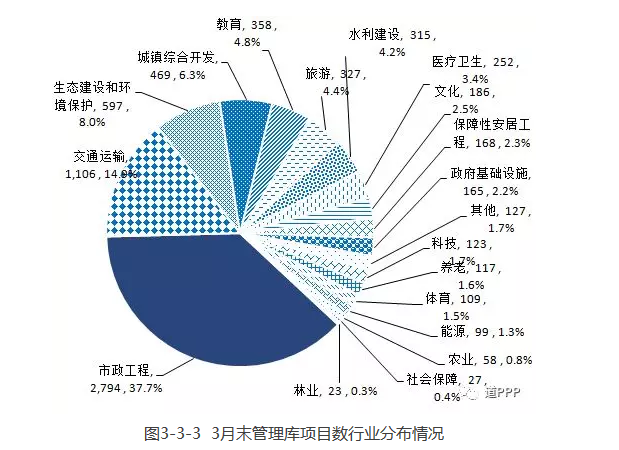 3月末管理庫內(nèi)各行業(yè)PPP累計項目數(shù)及投資額如圖3-3-3和圖3-3-4。其中,項目數(shù)前三位是市政工程、交通運輸、生態(tài)建設(shè)和環(huán)境保護,合計占管理庫項目總數(shù)的60.5%;投資額前三位是市政工程、交通運輸、城鎮(zhèn)綜合開發(fā),合計占管理庫總投資額的72.3%。