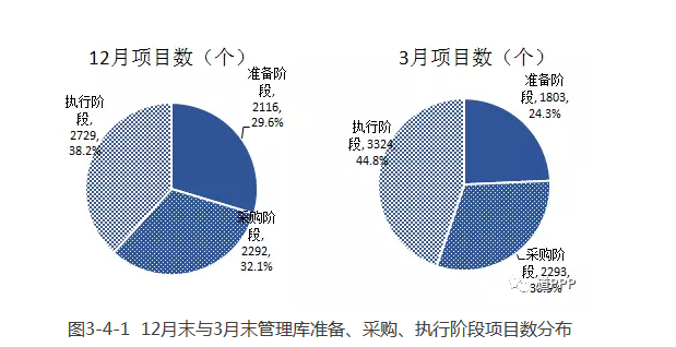 一季度管理庫新增已落地項目595個、投資額9,044億元,其中3月新增落地項目333個、投資額1,362億元,落地率環(huán)比增加5.4個百分點。3月末累計落地項目總數(shù)3,324個、投資額5.5萬億元,落地率44.8%,覆蓋除西藏以外的30個。ㄗ灾螀^(qū)、直轄市)及新疆兵團和19個領(lǐng)域。管理庫目前無移交階段項目。2017年12月末、2018年3月末各階段項目數(shù)如圖3-4-1。