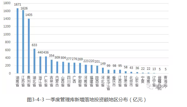 地域分布一季度新增落地項目數(shù)排名中,湖南、江蘇、貴州位列前三,分別為95個、55個、50個,合計占新增落地項目總數(shù)的33.6%。一季度新增落地項目投資額前三位是湖南、江蘇、貴州,分別為1,671億元、1,626億元、1,405億元,合計占新增落地項目總投資額的52.0%,如圖3-4-2和3-4-3。