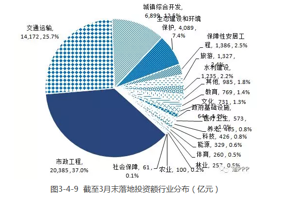 3月末累計落地項目數(shù)前三位是市政工程、交通運輸、生態(tài)建設(shè)和環(huán)境保護,分別是1,395個、465個和281個,合計占落地項目總數(shù)的64.5%。累計落地項目投資額前三位為市政工程、交通運輸、城鎮(zhèn)綜合開發(fā),分別為20,385億元、14,172億元和6,899億元,合計占落地項目總投資額的75.2%,如圖3-4-8和圖3-4-9。