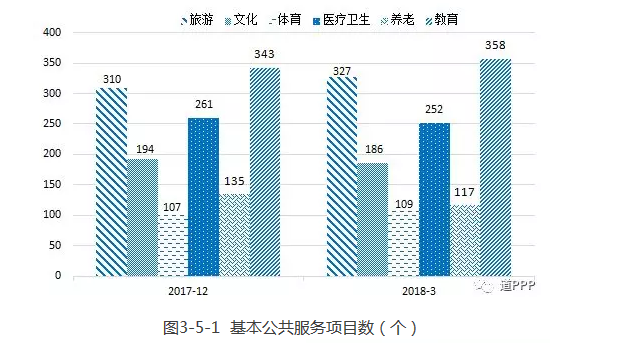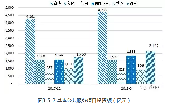 基本公共服務(wù)主要包括文化、體育、醫(yī)療、養(yǎng)老、教育、旅游等6個領(lǐng)域。一季度基本公共服務(wù)領(lǐng)域項目數(shù)比上季度末下降1個、新增投資額875億元。3月末累計項目總數(shù)1,349個、投資額12,084億元,分別占管理庫的18.2%和10.5%。項目數(shù)前三位是教育358個、旅游327個、醫(yī)療衛(wèi)生252個;投資額前三位是旅游4,733億元、教育2,142億元、醫(yī)療衛(wèi)生1,855億元。具體見圖3-5-1、圖3-5-2。
