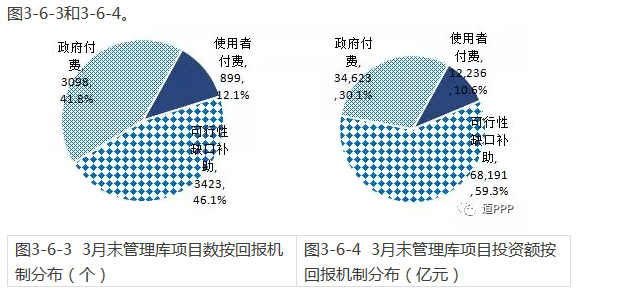 3月末管理庫中累計使用者付費類項目899個、投資額1.2萬億元,分別占管理庫的12.1%和10.6%;累計可行性缺口補助(即政府市場混合付費)類項目3,423個、投資額6.8萬億元,分別占管理庫的46.1%和59.3%;累計政府付費類項目3,098個、投資額3.5萬億元,分別占管理庫的41.8%和30.1%,具體情況如圖3-6-3和3-6-4。