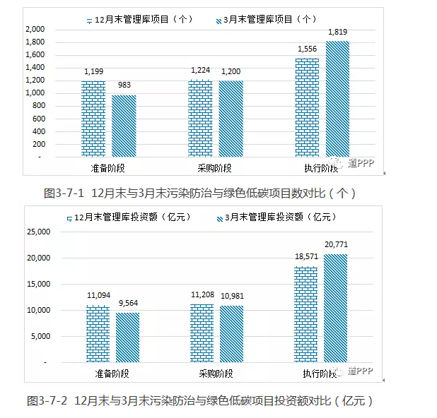 公共交通、供排水、生態(tài)建設(shè)和環(huán)境保護、水利建設(shè)、可再生能源、教育、科技、文化、養(yǎng)老、醫(yī)療、林業(yè)、旅游等多個領(lǐng)域PPP項目都具有支持污染防治和推動經(jīng)濟結(jié)構(gòu)綠色低碳化的作用。按該口徑,一季度管理庫中污染防治與綠色低碳項目新增項目23個、投資額443億元;累計污染防治與綠色低碳項目4,002個、投資額4.1萬億元,分別占管理庫的53.9%、35.9%。新增落地項目263個、投資額2,200億元;累計落地項目1,819個,投資額20,771億元。2017年12月末與2018年3月末情況對比見圖3-7-1和圖3-7-2。