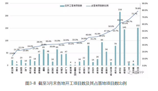 圖3-8 截至3月末各地開工項目數(shù)及其占落地項目數(shù)比例
