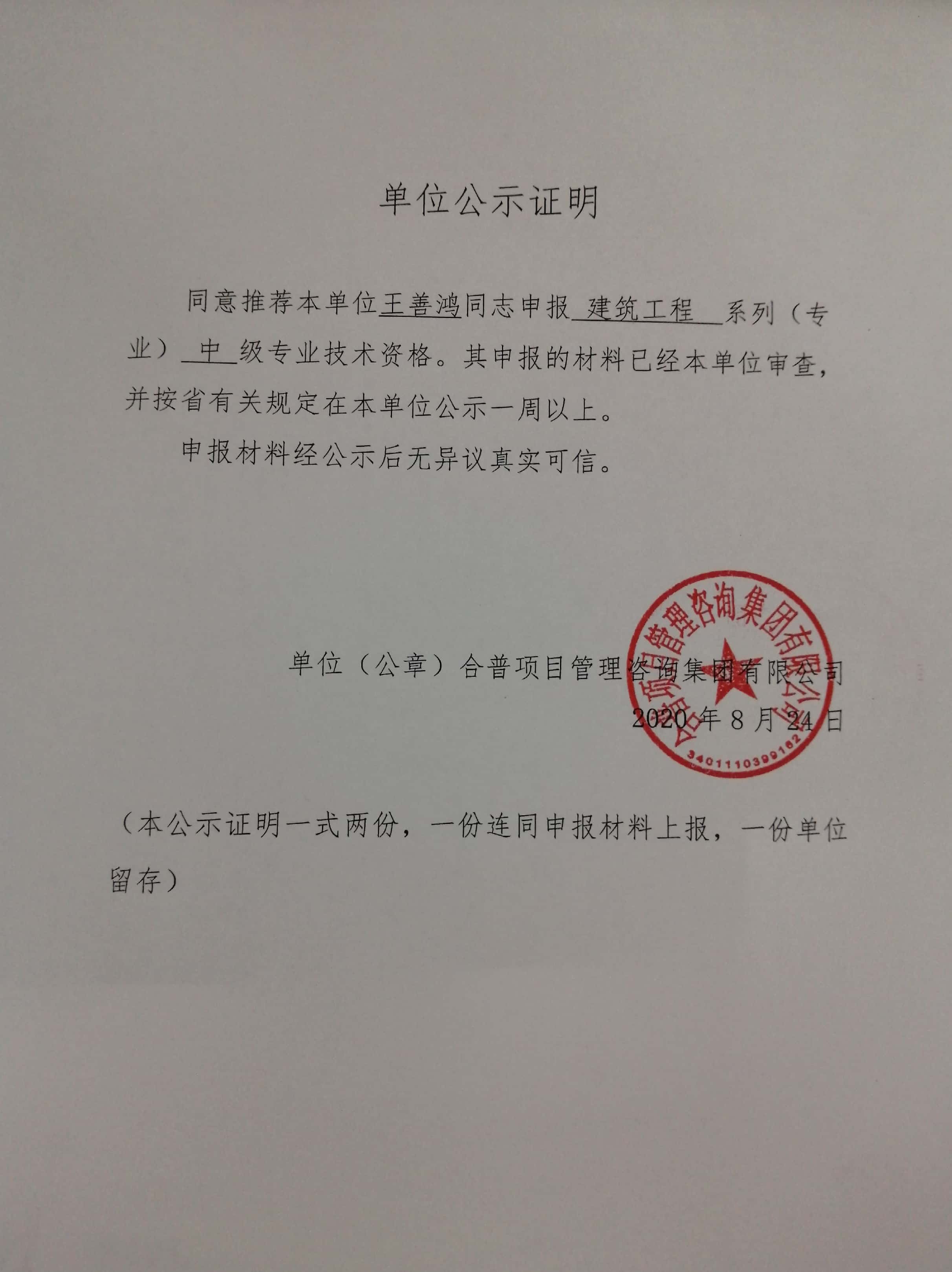 王善鴻同志申報(bào)建筑工程系列中級(jí)專(zhuān)業(yè)技術(shù)資格單位公示
