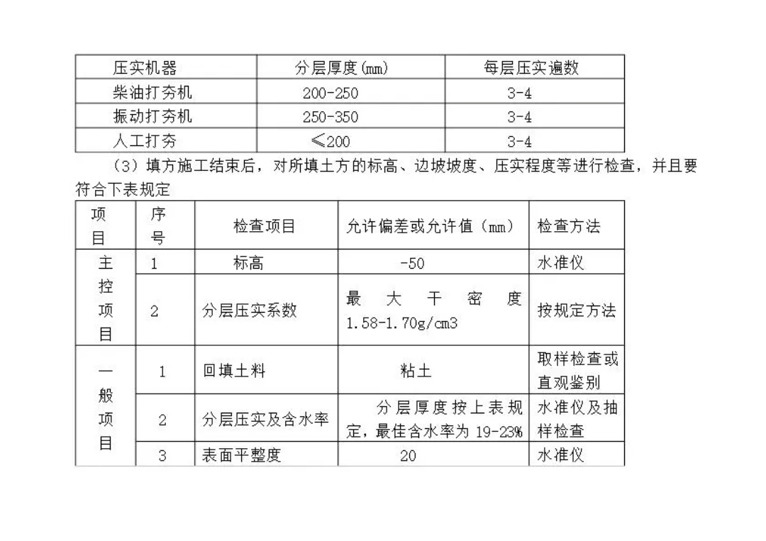 (2)填土施工過程中要檢查排水措施,每層填筑厚度,填方含水量,壓實程度。填筑厚度及壓實遍數(shù)可根據(jù)土質(zhì),壓實系數(shù)及所用機器確定,由于設計無具體要求,可參照下表執(zhí)行。