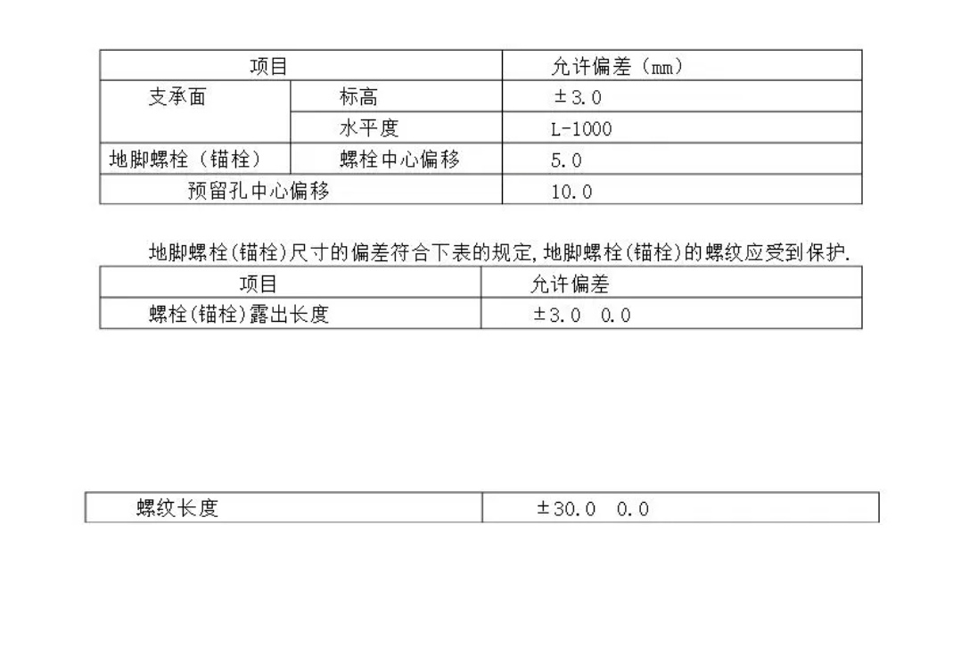 (1)建筑物的定位軸線、基礎軸線和標高,地腳螺栓的規(guī)格及其緊固應符合設計要求。 基礎頂面直接作為柱的支承面和基礎頂面預埋鋼板或支座作為柱的支承面對其支承面,地腳螺栓,(錨栓)位置的允許偏差應符合本表: