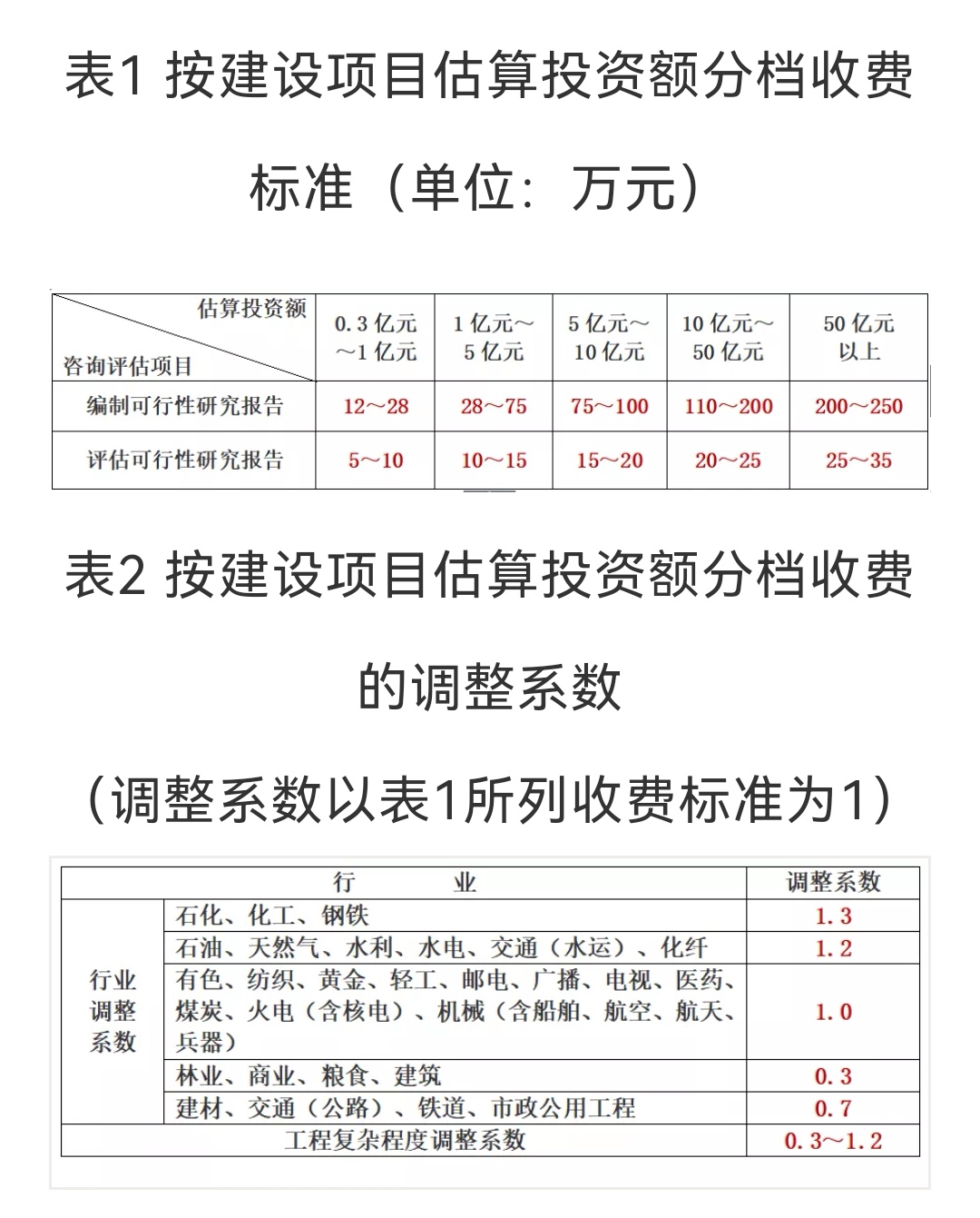 方法1:按建設項目估算投資額,分檔計算可行性研究報告編制和評估的咨詢服務費用(詳見表1),并由工程咨詢機構和委托單位根據(jù)各類項目復雜程度協(xié)商確定具體調整系數(shù)(詳見表2)