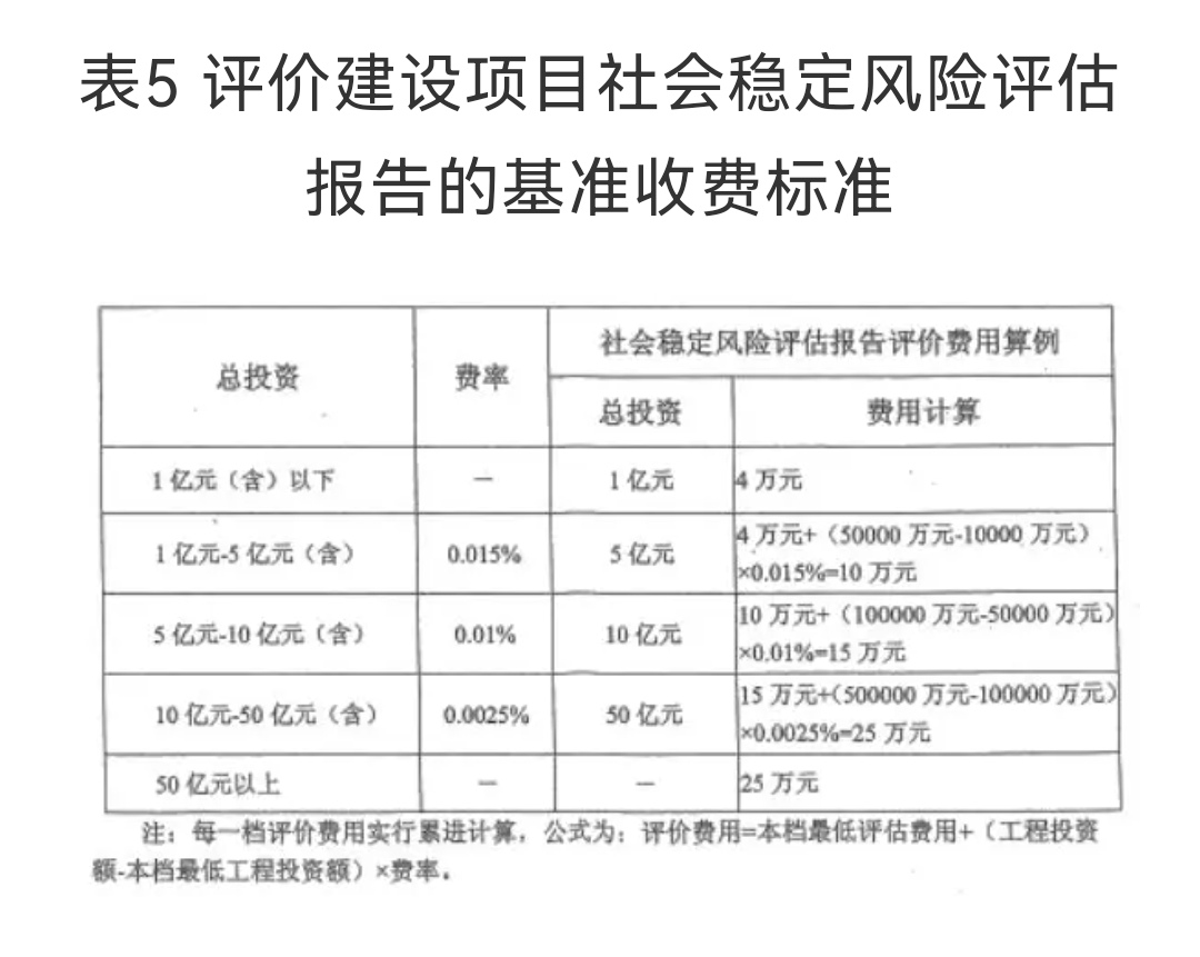 (2)評價建設項目穩(wěn)評報告的咨詢服務收費,以建設項目的估算總投資額為計費基準,根據(jù)分檔費率來綜合確定,費用范圍在4萬至25萬元(詳見表5);
