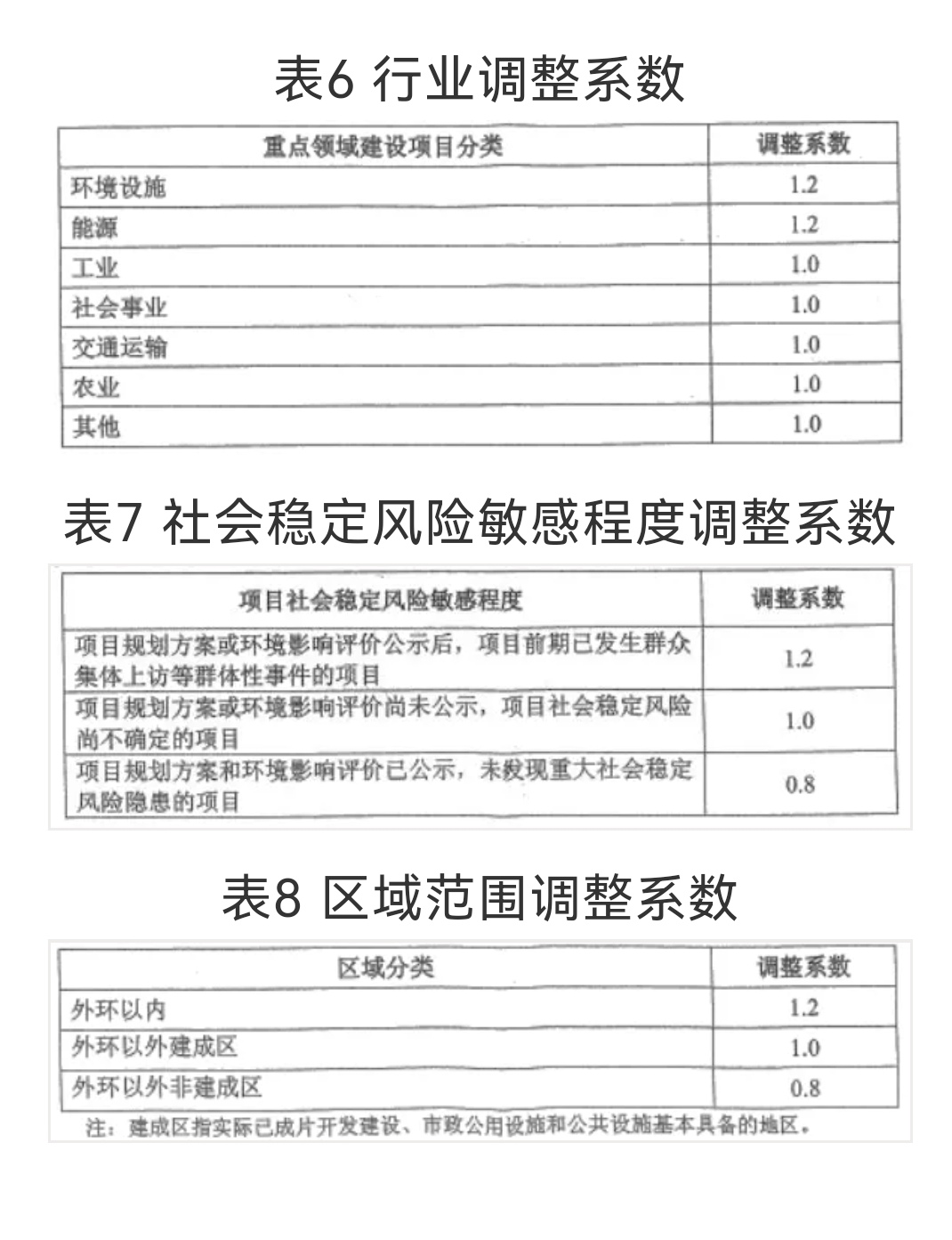 上述兩份文件給出“編制建設項目社會穩(wěn)定風險評估報告的基準收費標準”、“評價建設項目社會穩(wěn)定風險評估報告的基準收費標準”和三種“分檔收費調整系數(shù)”,其中: