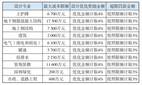 表2中,設(shè)計(jì)優(yōu)化金額=施工圖設(shè)計(jì)成本金額與初設(shè)圖成本金額的差量,設(shè)計(jì)優(yōu)化獎(jiǎng)勵(lì)金額=設(shè)計(jì)優(yōu)化金額×4%,超限罰款金額=設(shè)計(jì)各專業(yè)成本限額值×3%。